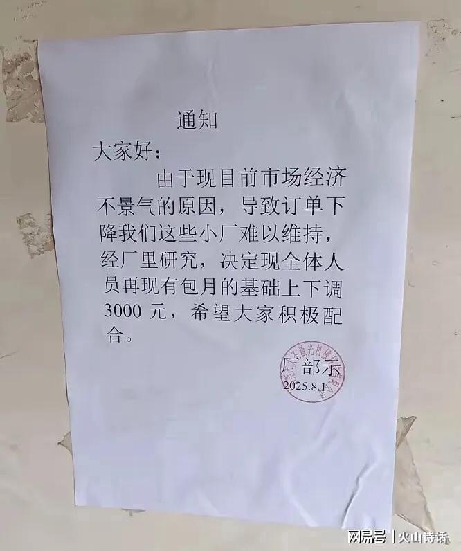 8月1日,东莞一工厂发通知称,由于市场不景气,订单下降,直言是小厂,难以维持, 决定全体员工的工资在现有包月的基础上,下调3000元。